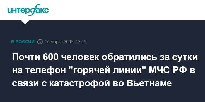 "За сутки на два телефона "горячей линии" в Москве и Санкт-Петербурге поступило более 600 звонков. Большинство из них были связаны с вопросом, касающимся произошедшей накануне автокатастрофы с российскими туристами во Вьетнаме", - сообщили "Интерфаксу" в воскресенье в Управлении информации в МЧС России.