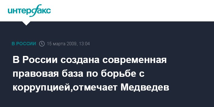 Москва. 15 марта. INTERFAX.RU - Президент России Дмитрий Медведев отмечает, что в стране создана современная правовая база по борьбе с коррупцией, теперь дело за реализацией этих законов на практике.