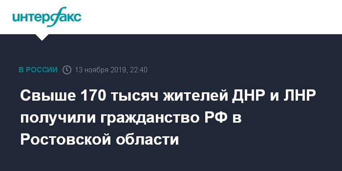 Москва. 13 ноября. INTERFAX.RU - Паспорта гражданина РФ с конца апреля 2019 года были выданы более 170 тыс. жителей самопровозглашенных Донецкой и Луганской народных республик (ДНР и ЛНР), сообщил губернатор Ростовской области Василий Голубев в эфире телеканала "Дон 24" в среду.