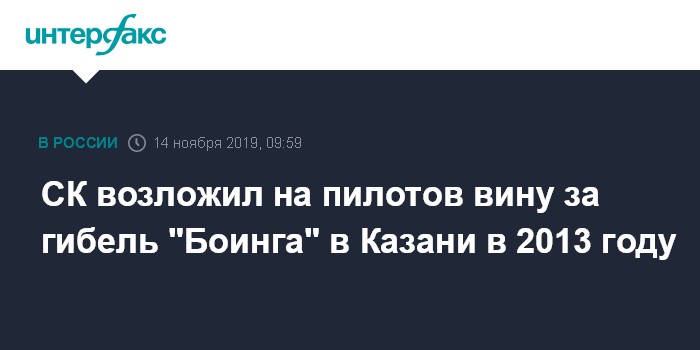 Москва. 14 ноября. INTERFAX.RU - Следственный комитет (СК) возложил на пилотов ответственность за крушение пассажирского самолета "Боинг 737" в Казани в 2013 году, в результате которой погибли 50 человек, сообщили в пресс-службе ведомства.