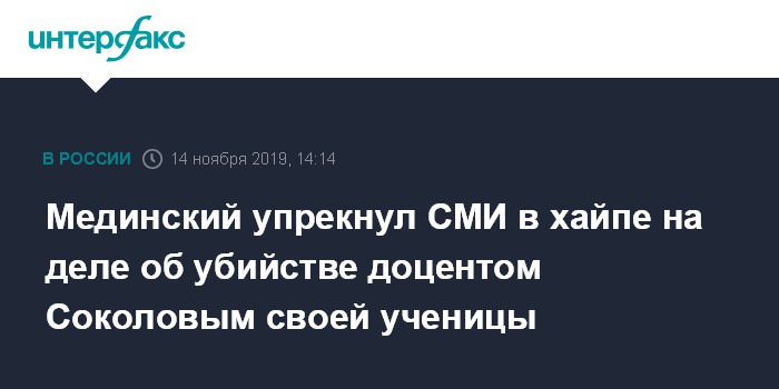 Москва. 14 ноября. INTERFAX.RU - Министр культуры РФ Владимир Мединский раскритиковал СМИ за освещение подробностей трагедии с убийством историком Олегом Соколовым своей аспирантки и сожительницы Анастасии Ещенко.