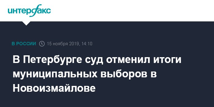 Москва. 15 ноября. INTERFAX.RU - В Петербурге Московский районный суд отменил итоги муниципальных выборов на участке №1393 в муниципалитете "Новоизмайлово", следует из картотеки суда.