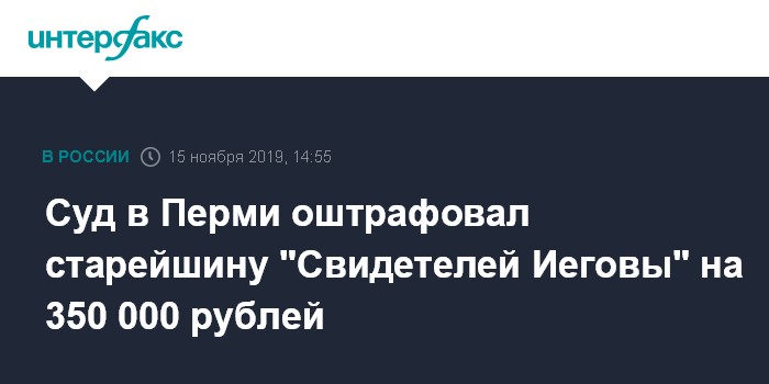Москва. 15 ноября. INTERFAX.RU - В Перми Орджоникидзевский суд оштрафовал старейшину местного отделения "Свидетелей Иеговы" (запрещены в России) Алексея Мецгера на 350 000 рублей. Как объяснил представитель суда, Мецгера признали виновным в участии в деятельности организации, запрещенной за экстремизм.