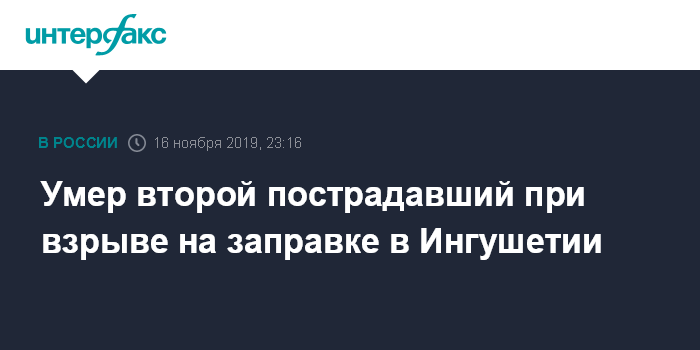 Москва. 16 ноября. INTERFAX.RU - Скончался еще один из пострадавших при взрыве газа в августе на автозаправочной станции в Сунже, сообщил в субботу агентству "Интерфакс" источник, знакомый с ситуацией.