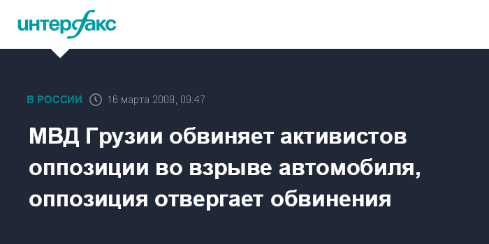 Москва. 16 марта. INTERFAX.RU - МВД Грузии заявляет, что активисты молодежной организации оппозиционного "Демократического движения - Единая Грузия", которое возглавляет экс-спикер парламента Нино Бурджанадзе умышленно взорвали автомобиль службы охранной полиции.