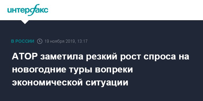 Москва. 19 ноября. INTERFAX.RU - Спрос на организованные новогодние туры по России и за рубеж вырос по различным направлениям на 17-50% в 2019 году, несмотря на не слишком хорошую экономическую ситуацию и отсутствие роста доходов населения, сообщила журналистам во вторник исполнительный директор Ассоциации туроператоров России (АТОР) Майя Ломидзе.