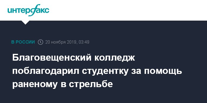 Москва. 20 ноября. INTERFAX.RU - Руководство колледжа в Благовещенске, где 14 ноября произошла стрельба, выразило благодарность студентке, которая оказала помощь раненному.