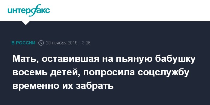 Москва. 20 ноября. INTERFAX.RU - Мать восьми детей, которых она оставила в московской квартире в ненадлежащих условиях, попросила забрать их в соцучреждение до улучшения своей жизненной ситуации, сообщила пресс-служба уполномоченного при президенте РФ по правам ребенка Анны Кузнецовой.