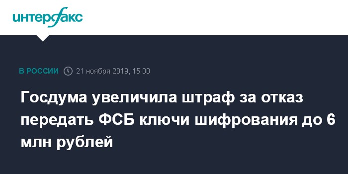 Москва. 21 ноября. INTERFAX.RU - Депутаты Госдумы приняли в третьем чтении закон о штрафах до 6 млн рублей для операторов связи за повторный отказ привести свое оборудование и программы в соответствие с требованиями ФСБ и предоставить ключ для декодирования сообщений пользователей.
