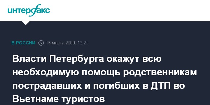 Москва. 16 марта. INTERFAX.RU - Власти Петербурга окажут помощь родственникам туристов, погибших и пострадавших в результате ДТП с автобусом во Вьетнаме, сообщила "Интерфаксу" начальник управления по туризму комитета по инвестициям и стратегическим проектам города Марианна Орджоникидзе.