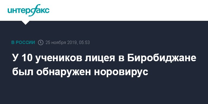 Москва. 25 ноября. INTERFAX.RU - Диагноз РНК-норовирус II группы подтвердился у 10 детей, обучающихся в лицее № 23 Биробиджана, где была зафиксирована вспышка кишечной инфекции, сообщает пресс-служба администрации города.