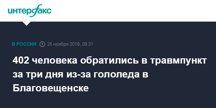 "За три дня в Благовещенске значительно возросло число граждан, получивших травмы при падении на улице. С 22 по 24 ноября за помощью к специалистам травмпункта обратились 402 человека (из них 45 детей). Большинство из них получили ушибы, растяжения, переломы при падении на скользких участках тротуаров", - отметили в Минздраве Приамурья.