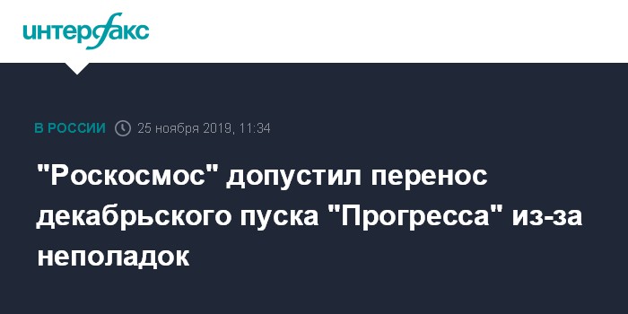 Москва. 25 ноября. INTERFAX.RU - Запланированный на 2 декабря запуск корабля "Прогресс МС-13" с космодрома Байконур может быть отложен из-за выявленных при проверке замечаний, сообщили в "Роскосмосе".