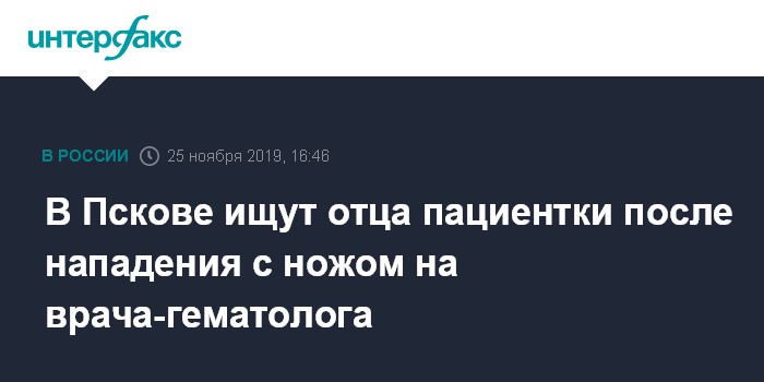 Москва. 25 ноября. INTERFAX.RU - В Пскове разыскивают того, кто напал с ножом на врача-гематолога из детской областной больницы и ранил ее. В полиции считают, что это мог сделать отец одной из пациенток, сообщила пресс-служба областного УМВД.
