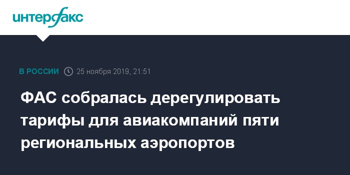 В настоящее время сборы и тарифы на обслуживание авиакомпаний дерегулированы только в аэропортах Московского авиаузла - "Шереметьево", "Домодедово" и "Внуково", соответствующей приказ ФАС вступил в силу в 2016 году. Ранее в ноябре служба сообщила, что решила частично отменить ценовое регулирование и в петербургском "Пулково", а именно на всех рейсах за рубеж и в Москву. Этот приказ начнет действовать с 2020 года.