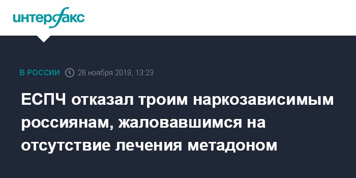 Москва. 26 ноября. INTERFAX.RU - Европейский суд по правам человека (ЕСПЧ) отказал в удовлетворении жалобы трех россиян на отказ врачей лечить их на родине от наркомании методом "метадоновой терапии" (назначение метадона взамен употребляемого наркотика), сообщили в пресс-службе министерства юстиции РФ.