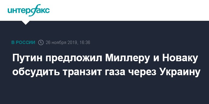 Москва. 26 ноября. INTERFAX.RU - Недавний разговор президентов России и Украины Владимира Путина и Владимира Зеленского касался в основном вопросов энергетики, заявил Путин министру энергетики Александру Новаку и главе "Газпрома" Алексею Миллеру. Он предложил им это обсудить.