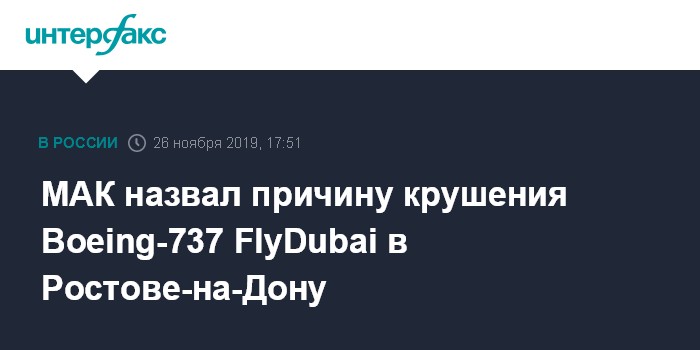 Москва. 26 ноября. INTERFAX.RU - Авиакатастрофа Boeing-737 FlyDubai в Ростове-на-Дону, унесшая в 2016 году жизни 62 человек, случилась из-за ошибки командира, следует из итогового доклада Межгосударственного авиационного комитета (МАК).