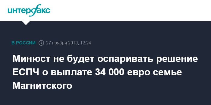 Москва. 27 ноября. INTERFAX.RU - Минюст России решил не обжаловать решение Европейского суда по правам человека, который присудил 34 000 евро компенсации родственникам погибшего в СИЗО юриста фонда Hermitage Capital Сергея Магнитского. Об этом сообщил глава аппарата уполномоченного России при ЕСПЧ Андрей Федоров.