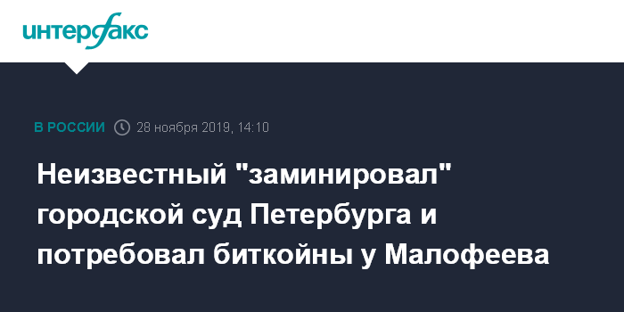Москва. 28 ноября. INTERFAX.RU - В Санкт-Петербургском городском суде начали эвакуацию в связи с угрозой взрыва, сообщила Объединенная пресс-служба городских судов. Телефонный террорист требует криптовалюту у основателя телеканала "Царьград" Константина Малофеева.
