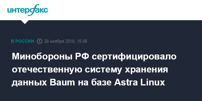 Минобороны РФ сертифицировало отечественную систему хранения данных Baum на базе Astra Linux