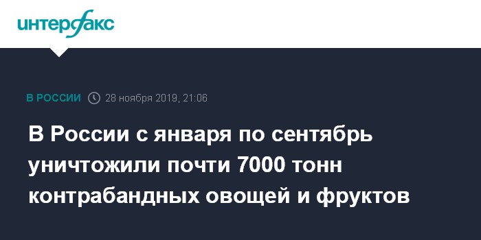 Москва. 28 ноября. INTERFAX.RU - За первые девять месяцев 2019 года Россельхознадзор уничтожил 6 720 тонн незаконно импортированной растительной продукции, объявила начальник управления фитосанитарного и семенного контроля службы Ирина Андреевская.