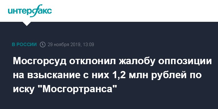 Москва. 29 ноября. INTERFAX.RU - Мосгорсуд отклонил апелляцию оппозиционеров на решение Коптевского суда, который в сентябре взыскал с них 1 218 581 руль и 58 копеек в пользу "Мосгортранса". Транспортное предприятие добивалась компенсации ущерба, понесенного из-за акции 27 июля. 1 млн 218 тыс. 591 руб. 58 коп