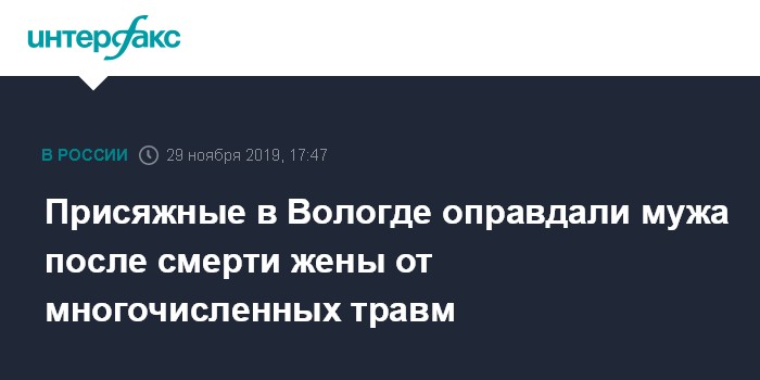 Москва. 29 ноября. INTERFAX.RU - Присяжные в Вологодском городском суде вынесли оправдательный вердикт Роману Крюкову, которого обвиняли в том, что забил жену до смерти. Оправдательный вердикт в регионе они вынесли впервые, сообщила объединенная пресс-служба судов Вологодской области.