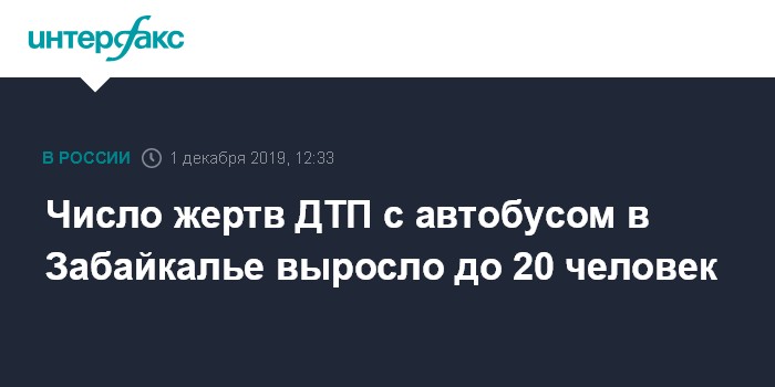 Москва. 1 декабря. INTERFAX.RU - По уточненным данным, в результате падения автобуса с моста в Забайкальском крае погибли 20 человек, сообщил "Интерфаксу" информированный источник.