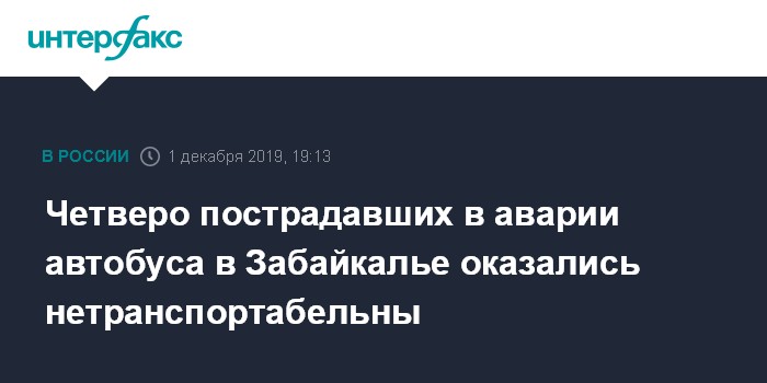Москва. 1 декабря. INTERFAX.RU - Четверо пострадавших в ДТП в Забайкалье остаются в тяжёлом состоянии, сообщает Минздрав России. В ведомстве уточнили, что они нетранспортабельны и остаются в Шилкинской и Нерчинской больницах