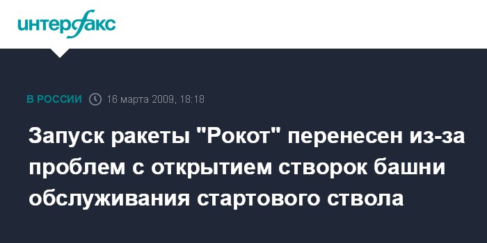Москва. 16 марта. INTERFAX.RU - Причиной отмены запуска ракеты-носителя "Рокот" стал отказ в открытии створок башни обслуживания стартового стола на космодроме Плесецк (Архангельская область), заявили журналистам в Европейском космическом агентстве.