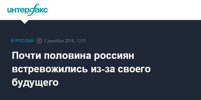 Москва. 2 декабря. INTERFAX.RU - Почти половина (48%) участников всероссийского опроса ВЦИОМ думают о своем будущем с беспокойством и тревогой, свидетельствуют данные исследования социологической организации, поступившие в понедельник в "Интерфакс".