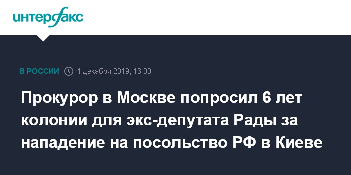 Москва. 4 декабря. INTERFAX.RU - Государственное обвинение в среду попросило Мосгорсуд приговорить бывшего депутата Верховной рады Украины Николая Рудьковского, участвовавшего в нападении на посольство России в Киеве в 2014 году, к шести годам колонии общего режима.