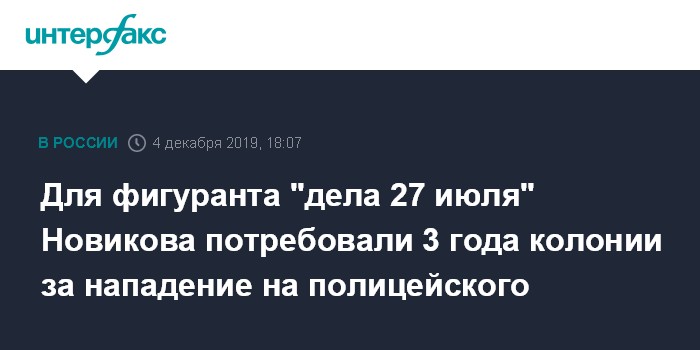 Москва. 4 декабря. INTERFAX.RU - Государственный обвинитель просит суд приговорить к трем годам колонии общего режима Павла Новикова, обвиняемого в применении насилия к представителю власти на несогласованной акции 27 июля в Москве, передает корреспондент "Интерфакса" из зала суда.