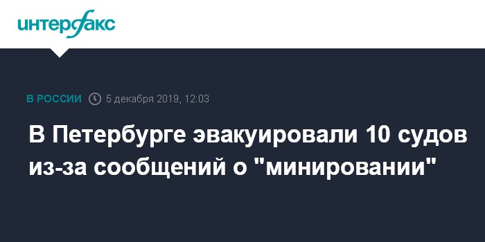 Москва. 5 декабря. INTERFAX.RU - В Петербурге продолжается волна "минирований", начавшаяся 28 ноября. Согласно сообщению объединенной пресс-службы судов города, четверг начался с эвакуации десяти судов. Часть из них уже вернулась к работе: опасных предметов и взрывчатых веществ в них не обнаружили.