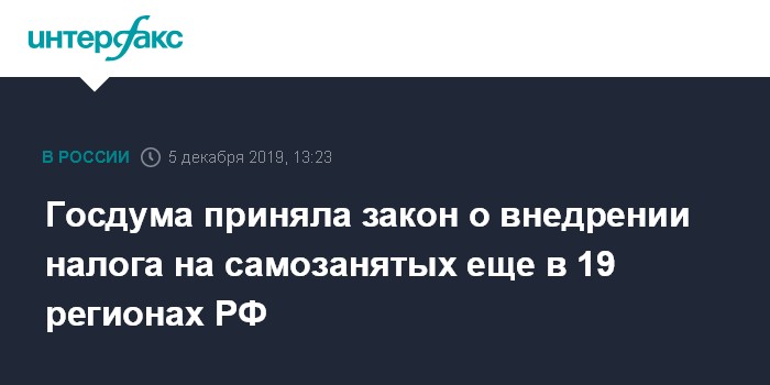 Москва. 5 декабря. INTERFAX.RU - Госдума РФ приняла в окончательном, третьем чтении закон, который с 1 января 2020 года включает в эксперимент по взиманию налога на профессиональный доход (НПД, налог на самозанятых) еще 19 регионов России.