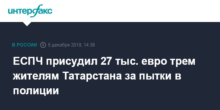Москва. 5 декабря. INTERFAX.RU - Европейский суд по правам человека в четверг утвердил мировое соглашение между РФ и тремя жителями Татарстана, пострадавшими от насилия со стороны полицейских, сообщается на сайте Страсбургского суда. Интересы потерпевших представляла в суде правозащитная организация "Зона права".