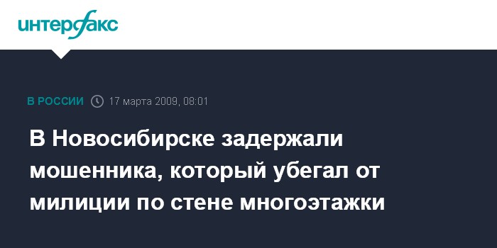 Новосибирск. 17 марта. INTERFAX.RU - В Октябрьском районе Новосибирска, спасаясь от милиции, подозреваемый в мошенничестве пытался убежать с помощью веревок с седьмого этажа жилого дома.