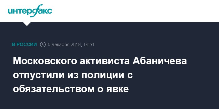 Москва. 5 декабря. INTERFAX.RU - Бывшего фигуранта так называемого дела о беспорядках в Москве Сергея Абаничева отпустили из Тверского ОВД, оформив протокол об административном правонарушении и обязательство о явке 6 декабря, сообщил "Интерфаксу" в четверг адвокат правозащитного проекта "Апология протеста" Федор Сирош.