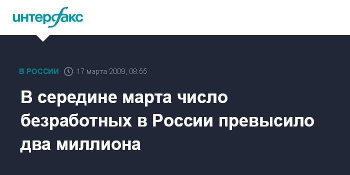 Москва. 17 марта. INTERFAX.RU - По состоянию на 10 марта 2009 года численность безработных граждан, зарегистрированных в органах службы занятости, составила 2 млн 077,6 тыс. человек (рост численности безработных составил 2,1%, за предыдущую неделю - 3,3%). Такие данные содержатся в мониторинге Минздравсоцразвития, который базируется на официальной информации о планируемых увольнениях работников. В сообщении министерства говорится, что информация получена о высвобождении работников 26852 организаций из всех субъектов РФ.