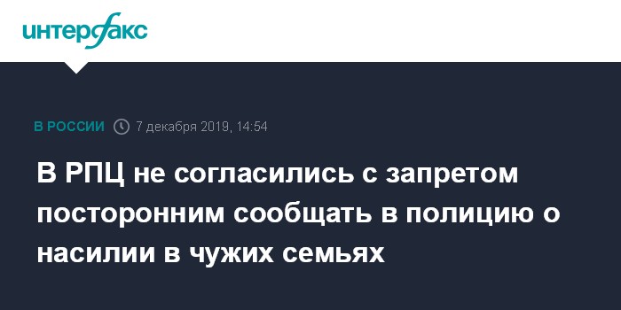 Москва. 7 декабря. INTERFAX.RU - В Русской православной церкви выразили несогласие с положением законопроекта о домашнем насилии, согласно которому общественные организации не получат права сообщать в полицию о насилии в семьях без разрешения пострадавших.