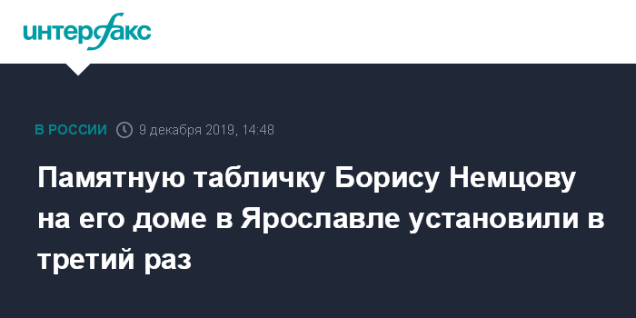 Москва. 9 декабря. INTERFAX.RU - На подъезде дома в Ярославле, в котором жил Борис Немцов повторно установлена мемориальная табличка. Об этом сообщил на своей странице в фейсбуке зампредседателя партии ПАРНАС и депутат ярославской облдумы Василий Цепенда.