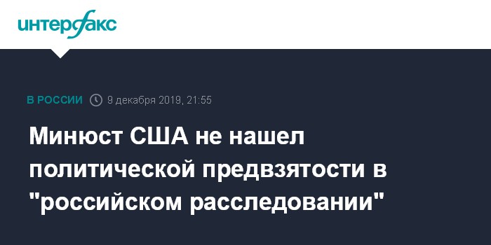 Москва. 9 декабря. INTERFAX.RU - В рамках внутреннего расследования, проведенного Министерством юстиции США, не было обнаружено никаких фактов политической предвзятости в "российском деле", сообщает в понедельник агентство Associated Press.