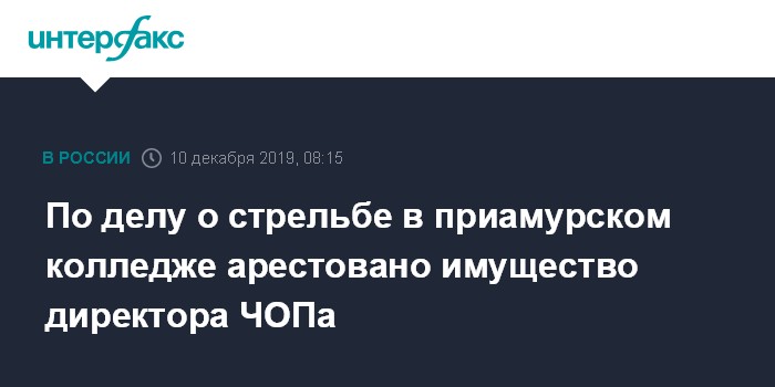 Москва. 10 декабря. INTERFAX.RU - В Благовещенске суд арестовал имущество гендиректора ЧОПа ООО "Сириус-А", охранявшего Амурский колледж строительства и ЖКХ, где 14 ноября студент устроил стрельбу. Арест на имущество наложен в связи с тем, что один из пострадавших подал иск о 2 млн рублей компенсации, сообщил адвокат Каро Жамкочян.
