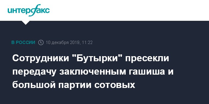 Москва. 10 декабря. INTERFAX.RU - Персонал московского следственного изолятора (СИЗО) номер 2 ("Бутырка") пресек попытку доставки заключенным почти 100 граммов гашиша и большой партии сотовых телефонов, сообщили во вторник в пресс-бюро столичного управления Федеральной службы исполнения наказаний (ФСИН).