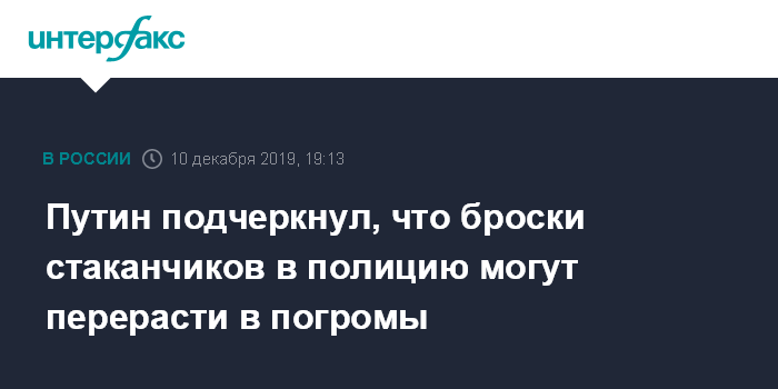 "Вы правильно сказали - пока еще. Вы знаете, в чем дело? Вот здесь коллега выступал, по-моему, коллега Резник сказал: "Бросил там какой-то пластиковый стаканчик в представителя органов власти. Бросил. Ничего. Потом пластиковую бутылку. Опять ничего. Потом уже бросит и стеклянную бутылку, а потом и камень, а потом и стрелять начнут, и громить магазины. Мы не должны допустить вот этого", - сказал Путин.