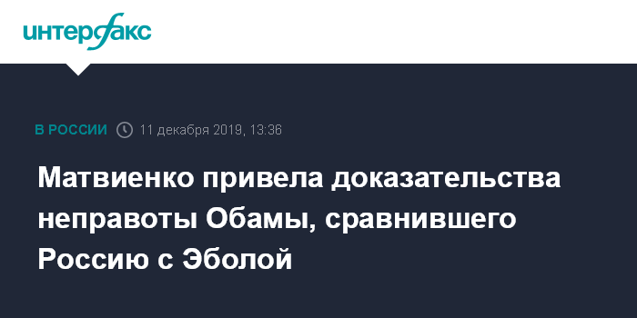 "В своё время президент США Барак Обама назвал основными мировыми угрозами вирус Эбола, Россию и международный терроризм. Именно в такой последовательности. Так вот основным доказательством того, что Россия не только не является угрозой, но и наоборот делает современный мир стабильным и безопасным, является то, что именно наша страна разгромила основные силы террористов в Сирии и именно наши новосибирские ученые изобрели вакцину против лихорадки Эбола", - сказала Матвиенко на заседании Совета Федерации в среду.