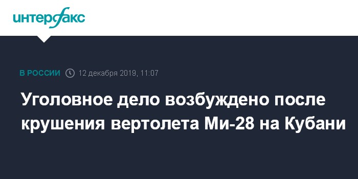 В пресс-службе Главного военного следственного управления (ГВСУ) Следственного комитета (СК) сообщили, что 12 декабря в военный следственный отдел СК РФ по Краснодарскому гарнизону из войсковой части 35666 поступило сообщение о крушении вертолета Ми-28. По данному факту в этот же день возбуждено уголовное дело по признакам преступления, предусмотренного статьей 351 УК РФ (нарушение правил полетов или подготовки к ним).