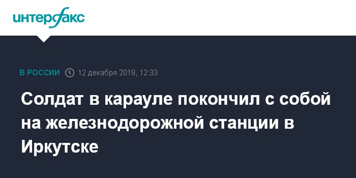 Москва. 12 декабря. INTERFAX.RU - Военнослужащий покончил с собой на железнодорожной станции Иркутск-Сортировочный в Иркутске, сообщил агентству "Интерфакс" в четверг информированный источник.