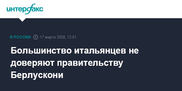Москва. 17 марта. INTERFAX.RU - Деятельность правительства Италии вызывает недовольство у 52% жителей страны, говорится в опросе "Ипр маркетинг", результаты которого публикует во вторник на своем веб-сайте газета "Репубблика". Издание отмечает, что уже в течение трех месяцев правительство поддерживают менее 50% итальянцев.